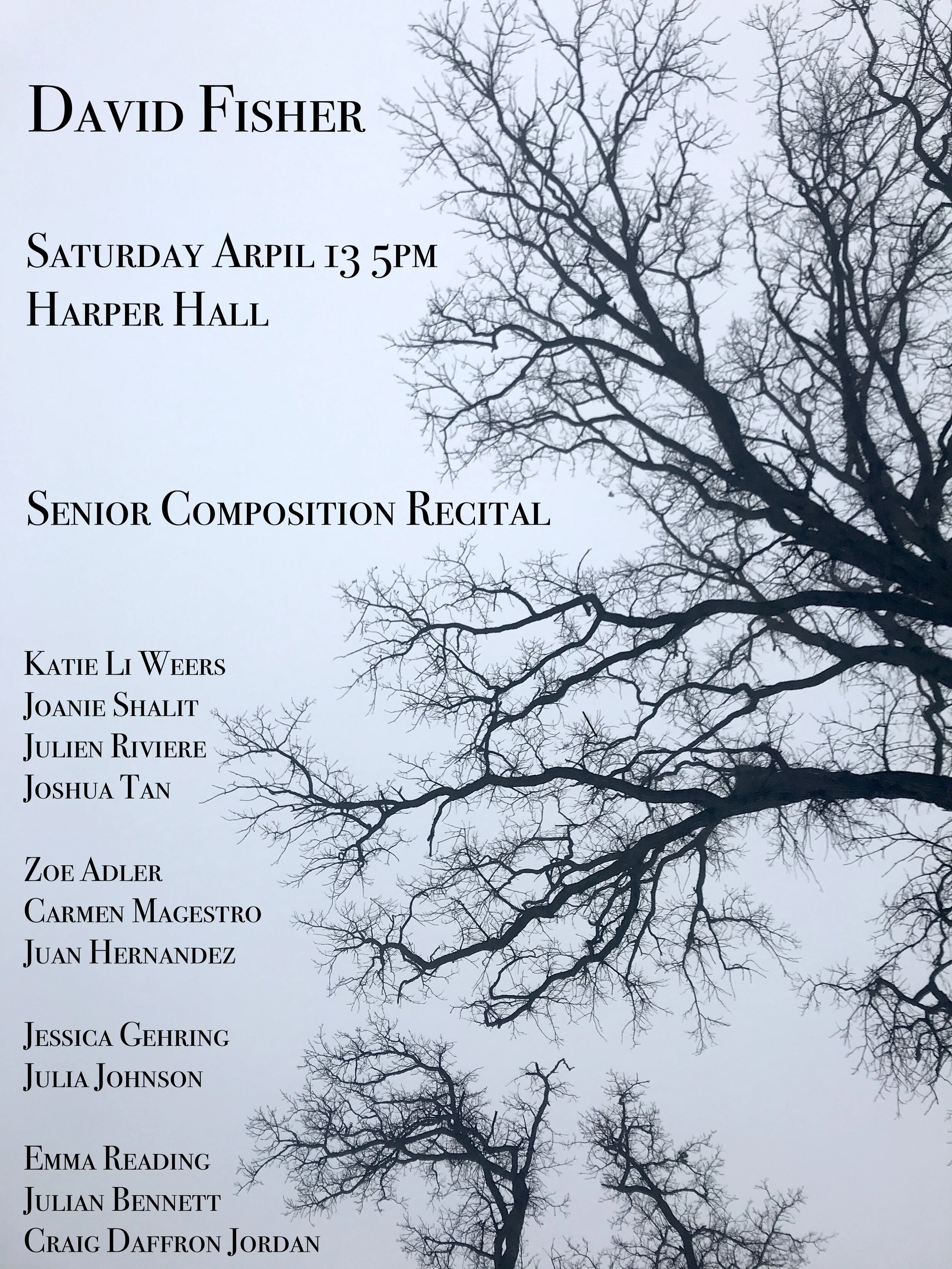 As a final requirement for the Bachelor of Music in Composition, I will present a concert of my own compositions written during my time at Lawrence. Each work draws inspiration from the forest, ranging from petrification of wood to the not-so-sweet mythical creatures that inhabit them. Many of my wonderful friends and musicians of the Lawrence University Conservatory of Music will breathe life into these musical processes and legends. The hour-long recital will begin at 5pm on Saturday, April 13th, 2019 at Harper Hall within the Music-Drama Center at the Lawrence University Conservatory of Music.